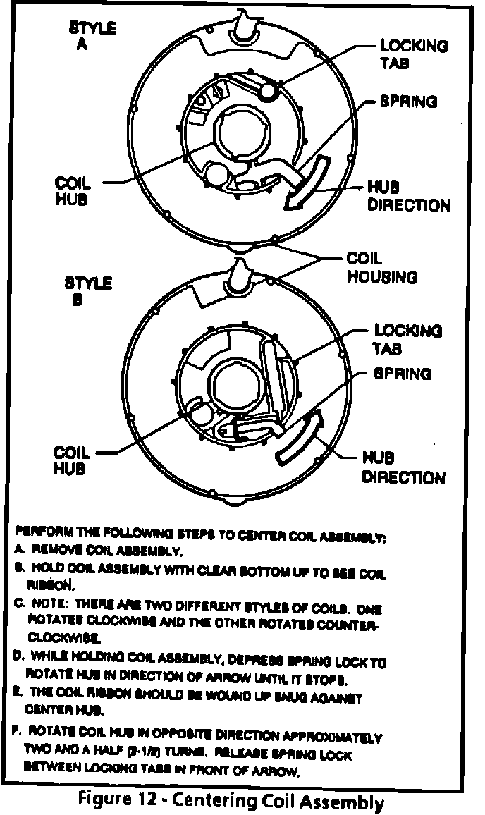 Figure 12 on page 3F5-7 in SECTION 3F5 (SIR TILT STEERING COLUMN UNIT REPAIR) of the 1991 "Y" Service Manual has been updated to reflect SIR Coil Assembly Centering Procedures. Two SIR Coil Assemblies are available from GMSPO when a replacement Coil Assembly is ordered. One is designed to be rotated clockwise, the other counterclockwise, when centering the coil before installation. The attached replacement Figure 12 reflects the procedure for both types of SIR Coil Assembly; only one type is currently shown in the 1991 "Y" Service Manual.