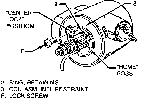 13. Install coil assembly, using horn tower on cancel cam on inner ring and projections on outer ring for alignment, then the coil assembly retaining ring. Move lock screw from CENTER LOCK position to HOME position on coil assembly.