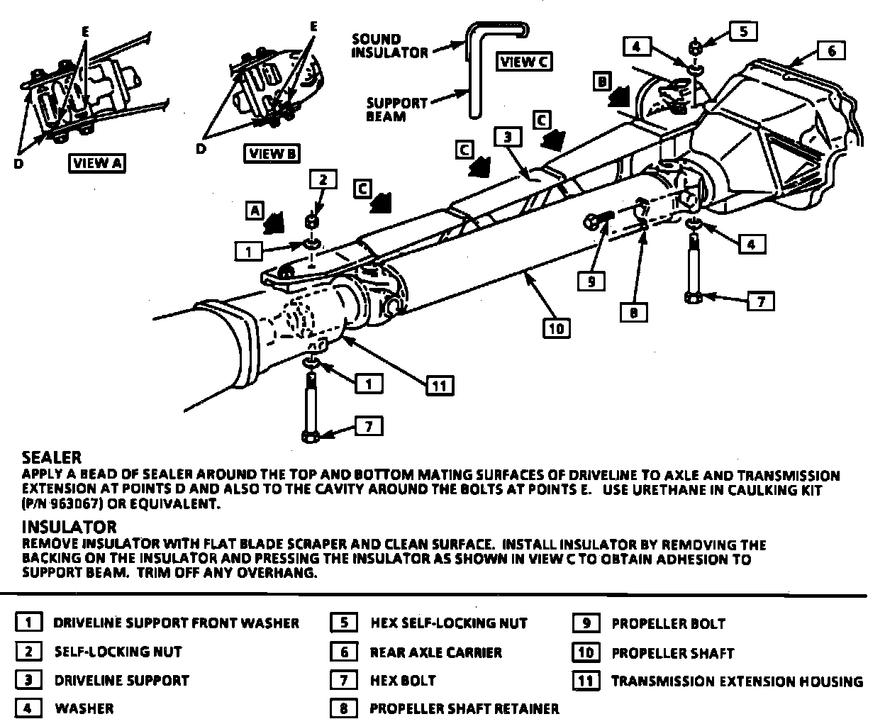 Fig. 2 Driveline Support Installation & Sealer Application Location. 1990-92: