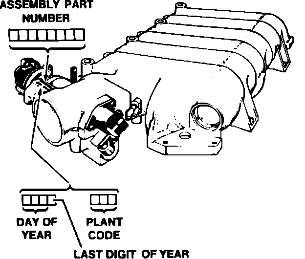 NOTE: An eight digit part identification number is stamped on the throttle body portion of the upper manifold assembly. Refer to this number if servicing or replacement is required. Refer to the disassembled view for identification of parts during repair procedures.