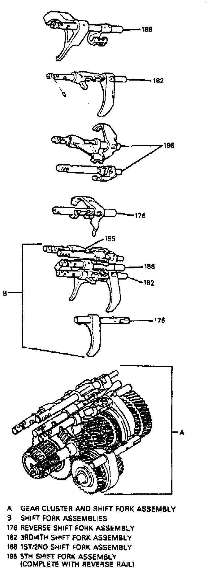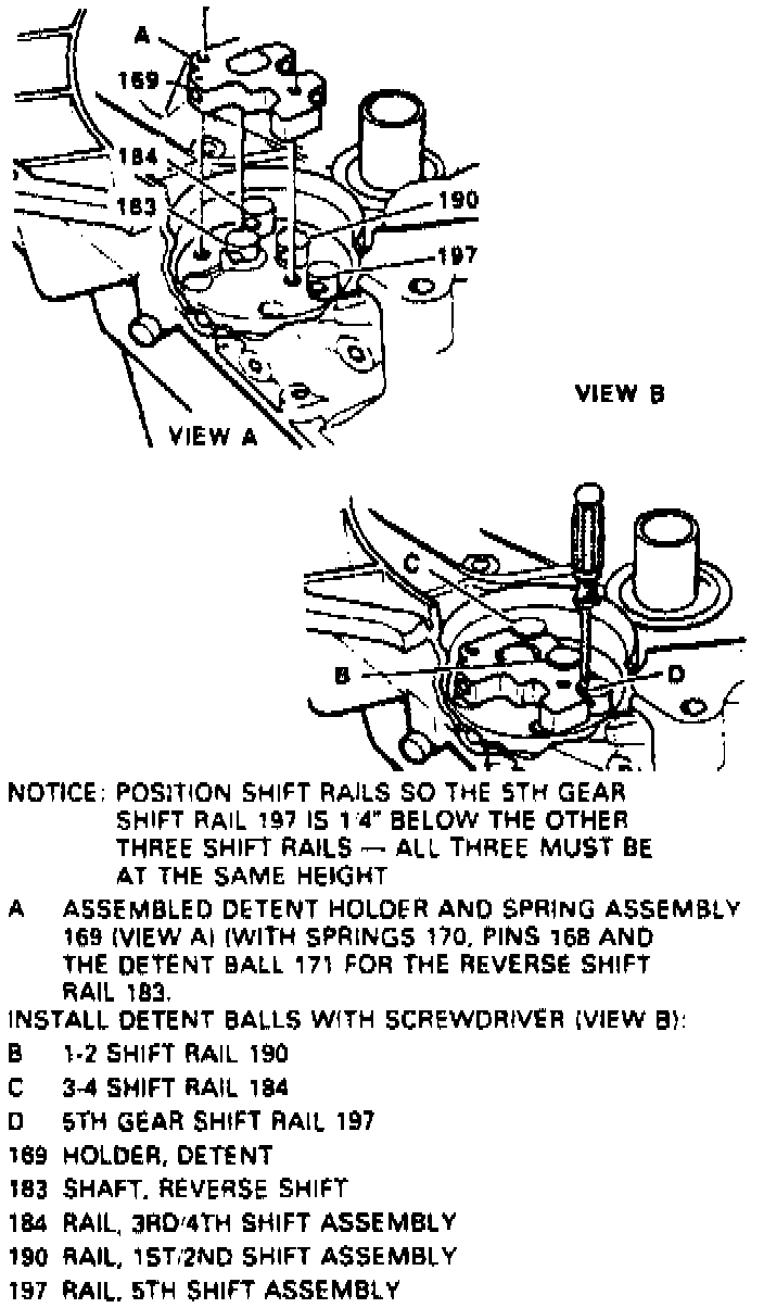 28. Install detent balls in the following order, 1-2 shift rail (188), 3-4 shift rail (182) then the fifth gear shift rail (195).