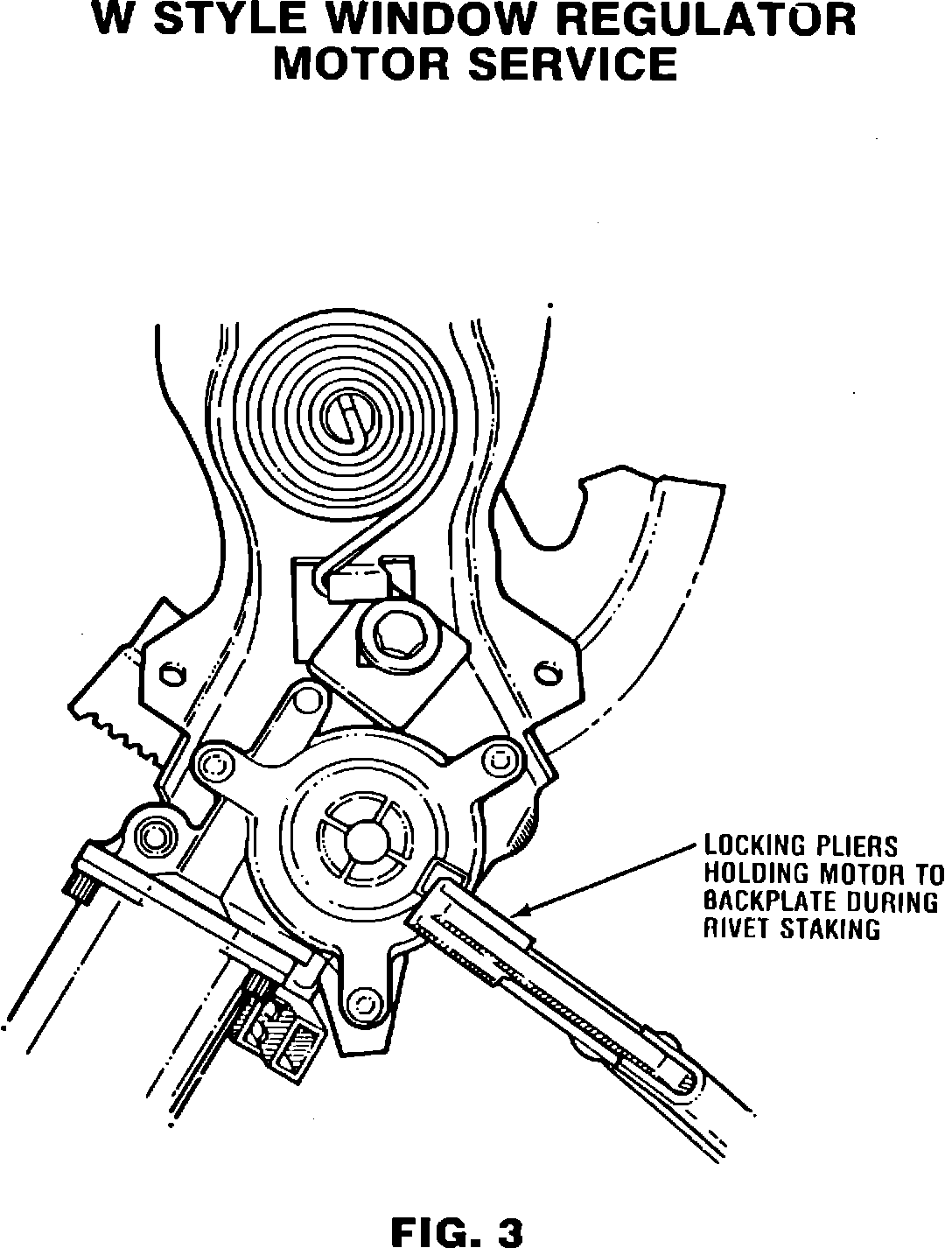 CAUTION: STEP 2 MUST BE PERFORMED WHEN REGULATOR IS REMOVED FROM DOOR. THE REGULATOR LIFT ARM IS UNDER TENSION FROM THE COUNTERBALANCE SPRING AND CAN CAUSE PERSONAL INJURY IF THE MOTOR IS REMOVED WITHOUT LOCKING THE SECTOR GEAR IN POSITION.