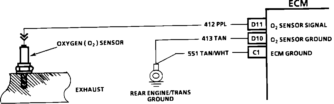 The ECM supplies a voltage of about 0.45 volt between terminals "D10" and "D11." (If measured with a 10 megohm digital voltmeter, this may read as low as 0.32 volts). When the Oxygen sensor reaches operating temperature, it varies this voltage from about .1 volt (exhaust is lean) to about 0.9 volt (exhaust is rich). The sensor is like an open circuit and does not produce a voltage when it is below 316°C (600°F). An open sensor circuit or cold sensor causes "OPEN LOOP" operation.