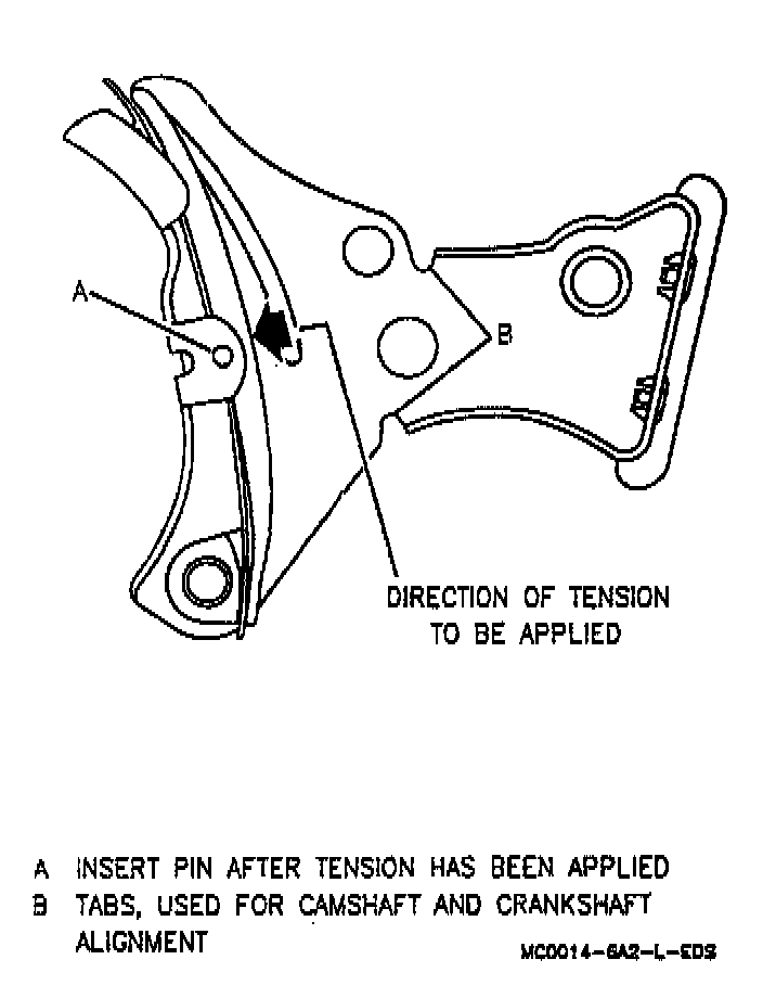 3. Align crankshaft and camshaft timing marks with "tabs" on tensioner.