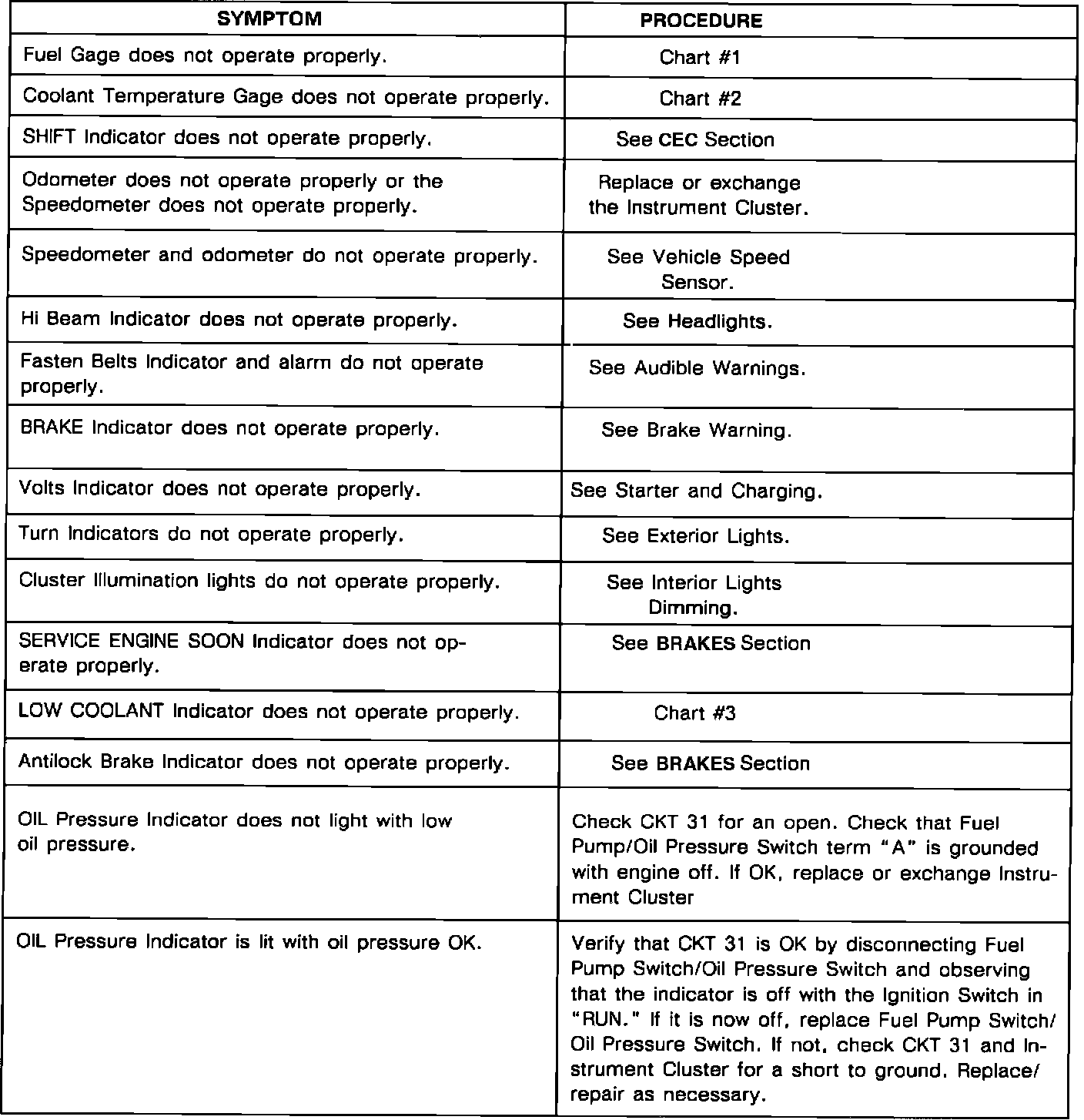 I/P Panel Symptom Chart: