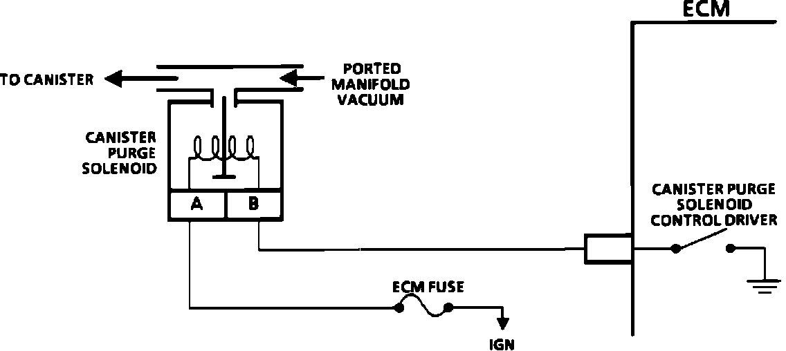 The Canister Purge Solenoid is controlled by the ECM and allows manifold and/or ported vacuum to purge the fuel evaporative cannister when energized.