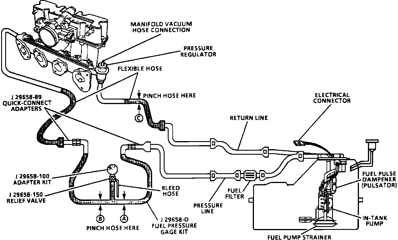 2. Restricting fuel flow at the fuel pressure gauge (at B) causes fuel pressure to build above regulated pressure. With battery voltage applied to the pump test terminal, pressure should rise above 325 kPa (47 psi) as the gauge outlet hose is restricted.