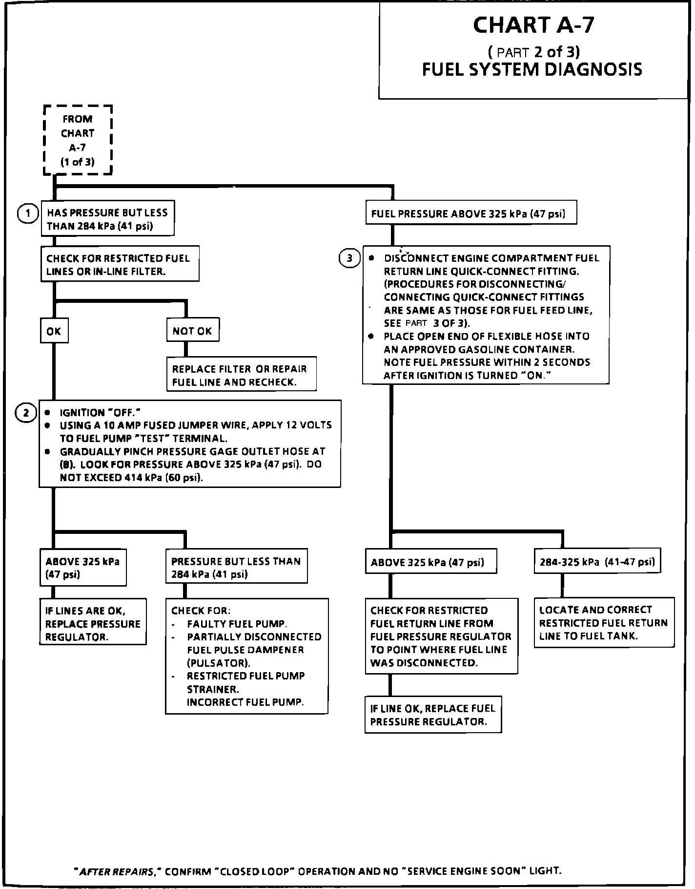 1. Pressure below 284 kPa (41 psi) may cause a lean condition and may set a Code 44 or Code 32. It could also cause hard starting cold and poor driveability. Low enough pressure will cause the engine not to run at all. Restricted flow may allow the engine to run at idle, or low speeds, but may cause a surge and stall when more fuel is required, as when accelerating or driving at high speeds.