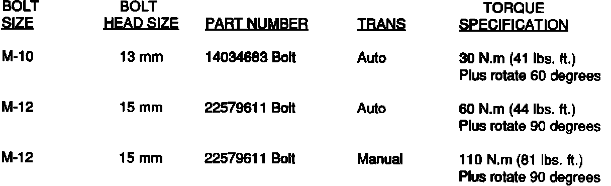 Later production 1992 and all 1993 model year 2.3L engines had M-12 bolts to attach the engine mount bracket (upper) to the block and have different tightening specifications than the M-10 bolt. When the engine mount bracket (upper) bolts are removed, replace them with new bolts (bolt GM P/N 22579611, without substitution). Tighten bolts to the specified N-m (lbs.ft.) then rotate the bolt the specified degrees with Torque Angle Meter J-36660.