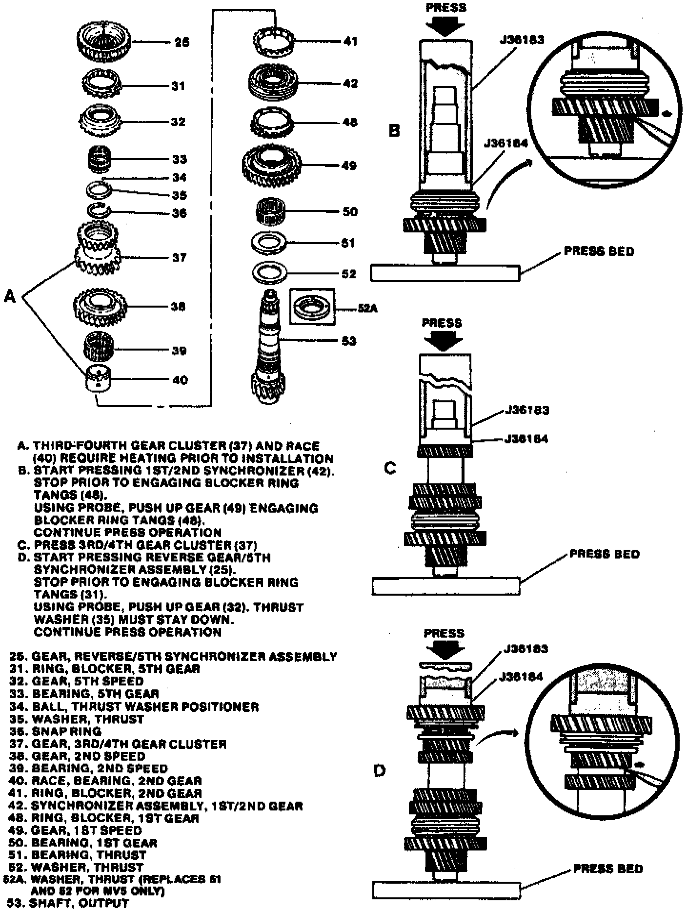 4. Using hydraulic press, press tube tool No. J-36183 and press tube reducer tool No. J-361 84, or equivalents, install 1-2 synchronizer assembly (42), noting the following: