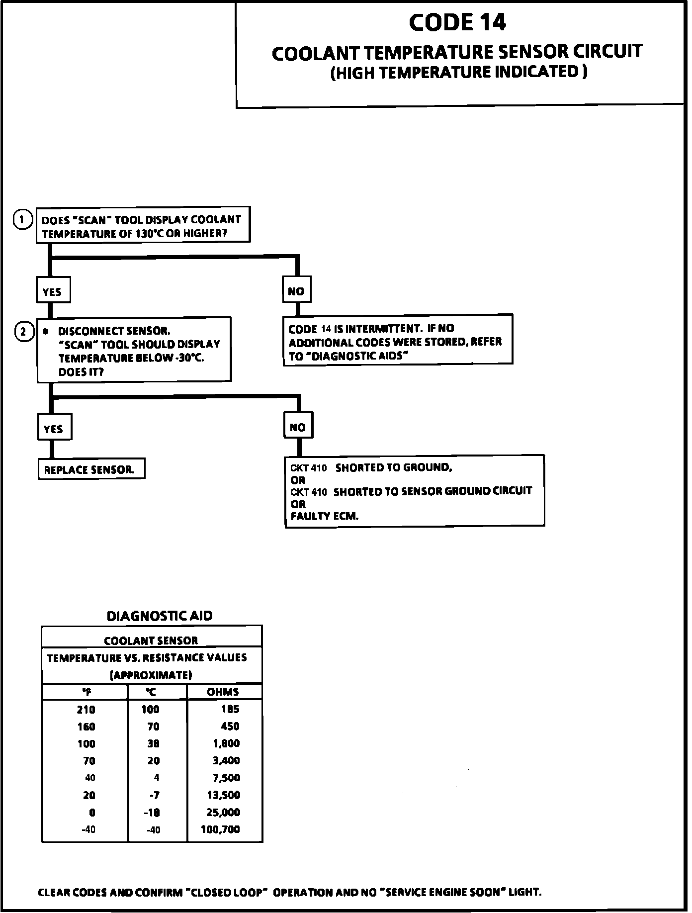 1. Code 14 will set if signal voltage indicates a coolant temperature above 130° (266°) for 3 seconds.