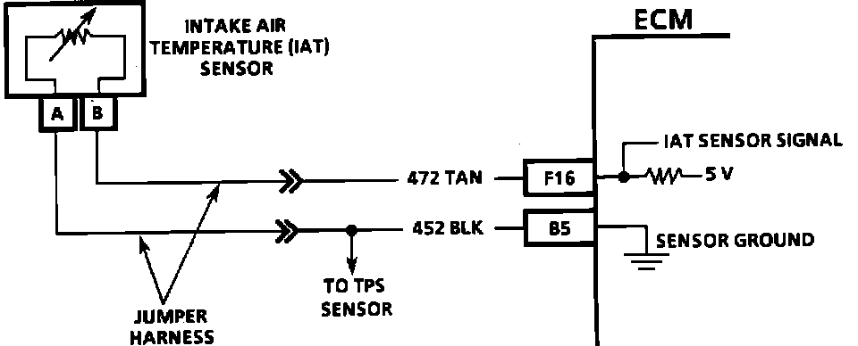 The Intake Air Temperature (IAT) sensor uses a thermistor to control the signal voltage to the Electronic Control Module (ECM). The ECM applies a voltage (4-6) on CKT 472 to the sensor. When manifold air is cold the sensor (thermistor) resistance is high, therefore the ECM will see a high signal voltage. As the air warms, the sensor resistance becomes less, and the voltage drops.