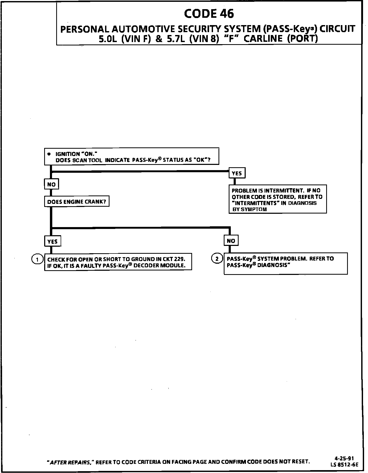 2. If a Code 46 is stored and the engine will not crank, it indicates that there is a PASS-Key problem or an incorrect key or starting procedure is being used.