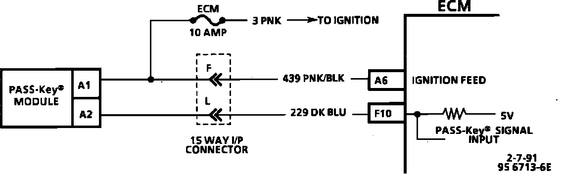The PASS-Key system is designed to disable vehicle operation if the incorrect key or starting procedure is used. The PASS-Key decoder module sends a signal to the ECM if the correct key is being used. If the proper signal does not reach the ECM on CKT 229, the ECM will not pulse the injectors "ON" and thus not allow the vehicle to be started.