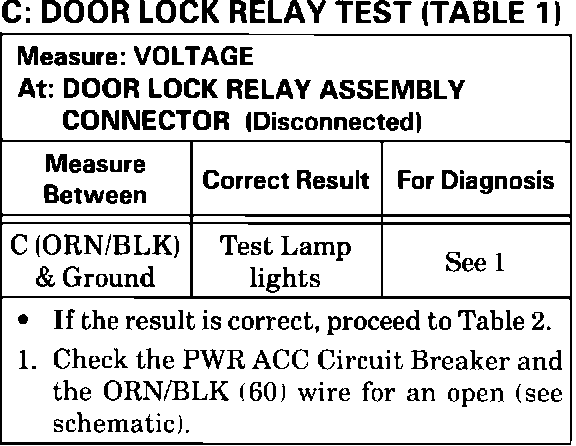 Test C: Door Lock Relay Test Table 1: