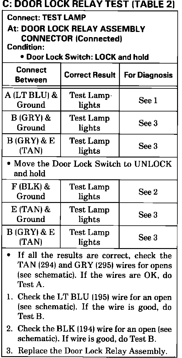 Test C: Door Lock Relay Test Table 2: