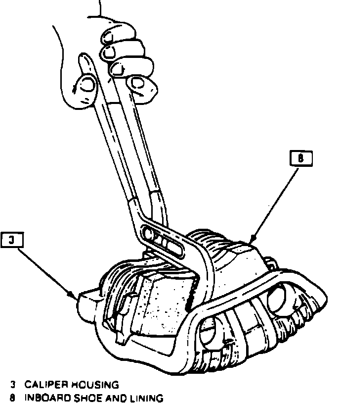 2. Position suitable pliers over caliper and center of inboard shoe and lining as shown, Fig. 2, then squeeze pliers to bottom pistons in caliper bores.