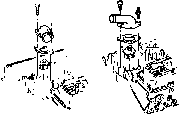 6. Remove thermostat housing attaching bolts, then remove housing and thermostat, Fig. 19.