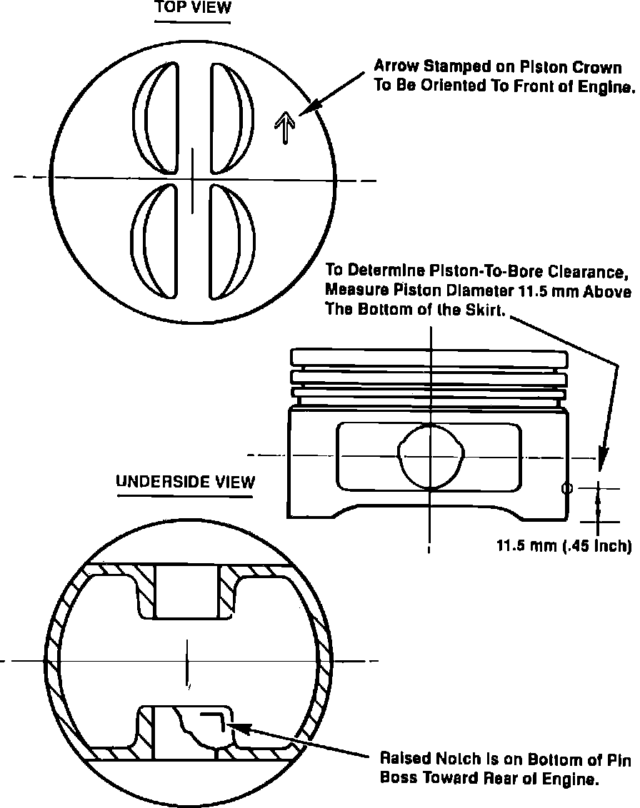 Beginning with 1990 models, a low friction light weight piston and new design ring pack are used. This piston and ring pack is not interchangeable with 1989 or previous piston and ring pack. The low friction light weight piston can be identified by a raised notch on the bottom of the piston pin bore located toward rear of engine, Fig. 13.