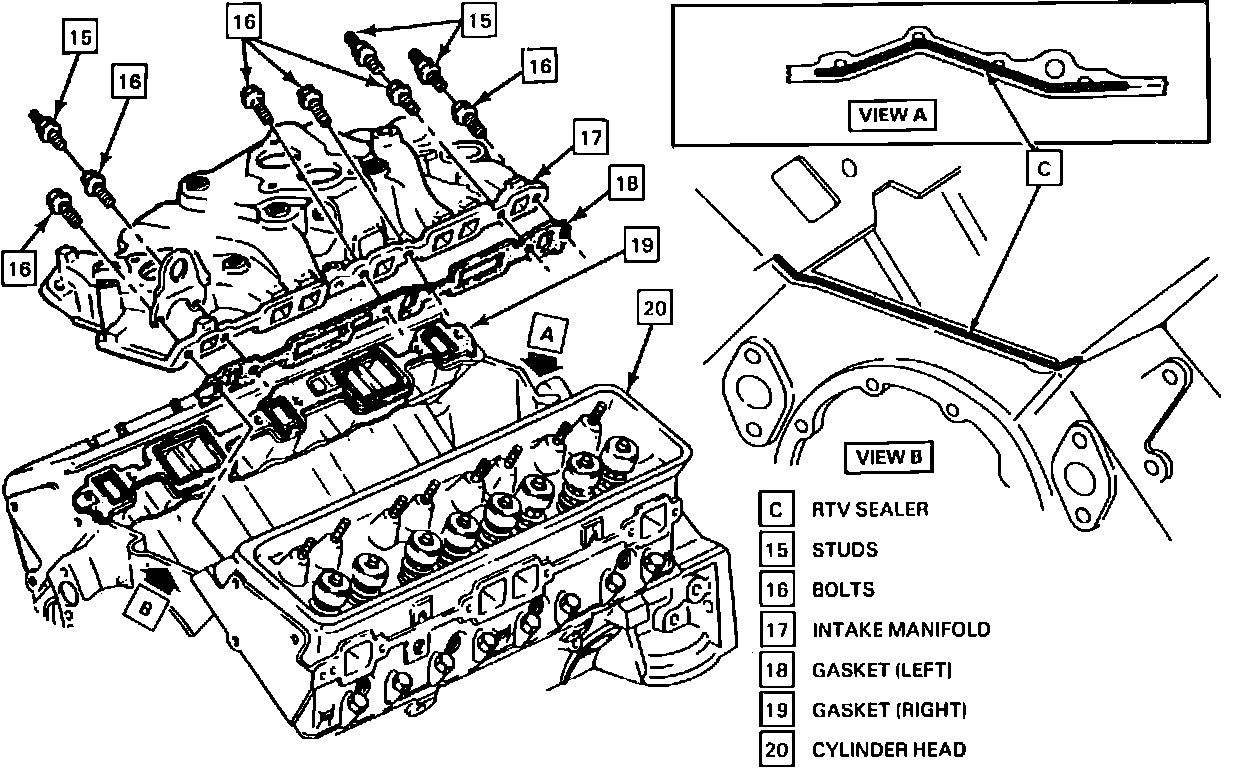 17. Ensure surfaces are clean and dry, then apply 3/16 bead of RTV sealer, GM P/N 1052914 or equivalent, on each block ridge and apply suitable sealer around water outlets, install gaskets and secure gasket position by extending bead of sealer approximately 1/2 inch onto gasket ends.