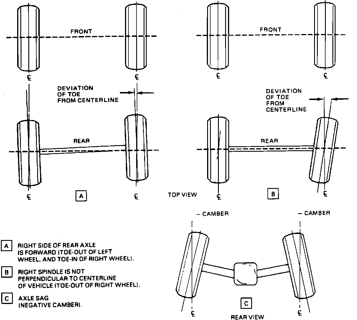 After front wheel alignment has been checked or adjusted, rear wheel alignment angles should be checked if vehicle still does not track properly or if excessive rear tire wear is present. Rear wheels should be parallel to and the same distance from the vehicle centerline, Fig. 6.