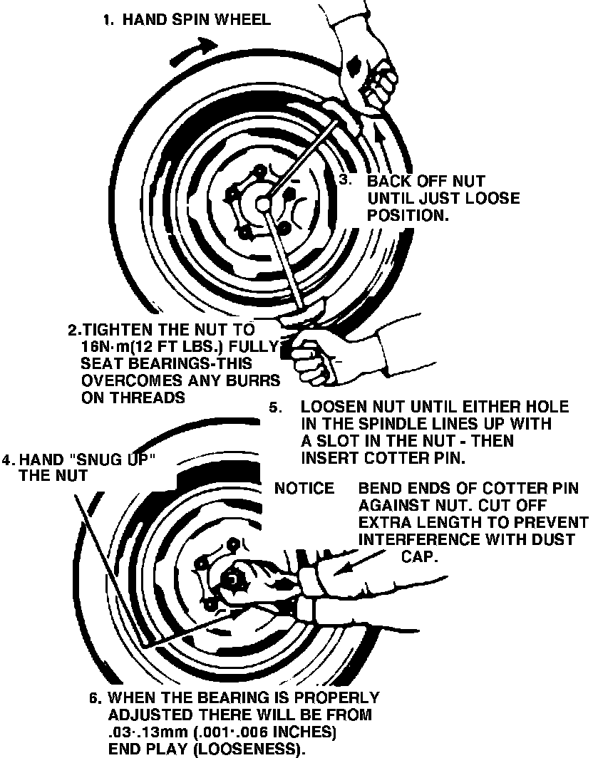 3. Install new cotter pin. With wheel bearing properly adjusted, there will be .001-.005 inch end play.