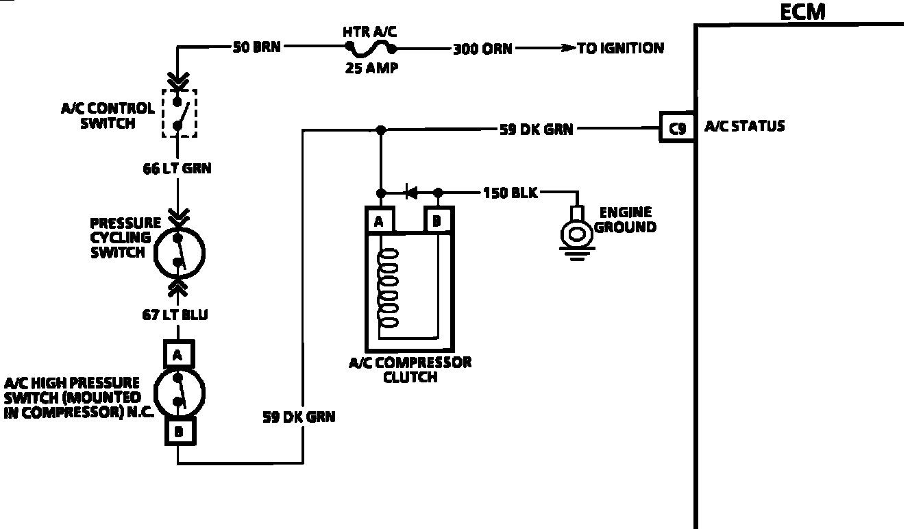 This signal indicates that the A/C control switch is turned "ON" and the high pressure and pressure cycling switch is closed. The computer uses this signal to adjust the idle speed, and on some models engages the A/C compressor clutch.