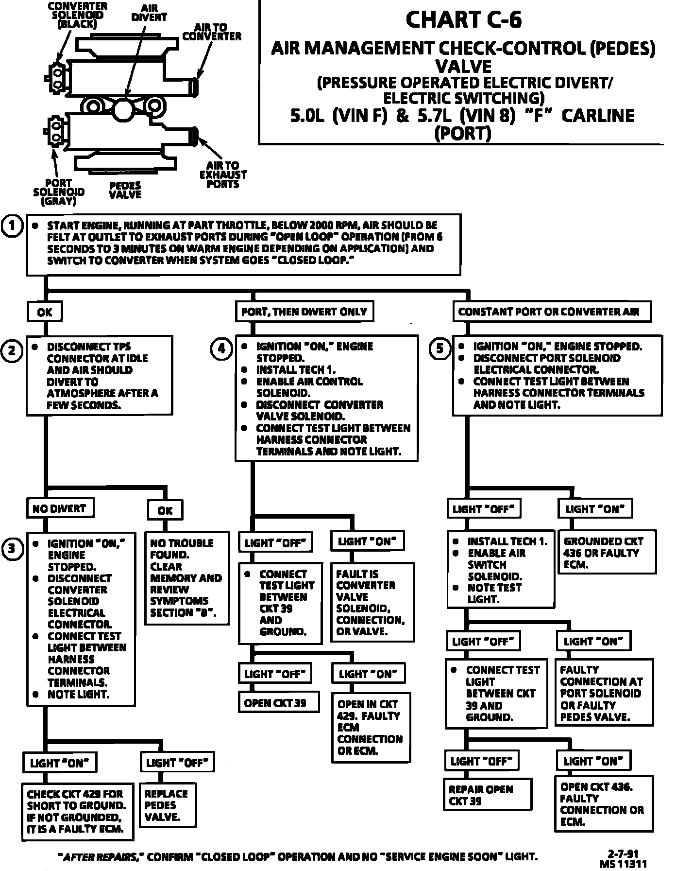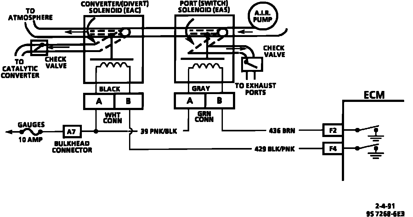 During cold start, the port solenoid is energized, which opens the port valve, and air is directed into the exhaust ports. As coolant temperature increases, or system goes into "Closed Loop", the port solenoid is de-energized, and the converter solenoid is powered, which allows the converter valve to be seated, and air is forced to the catalytic converter. If both solenoids are powered off, the air will be diverted to the atmosphere.