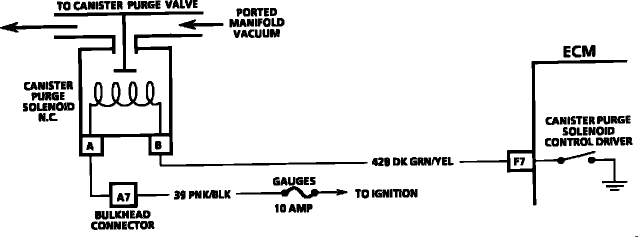 To regulate the canister purge, an ECM controlled electronic vacuum valve solenoid is used. The ECM uses information from various sensors to regulate the solenoid. If the following conditions are met with the engine running, the canister purge solenoid is energized: