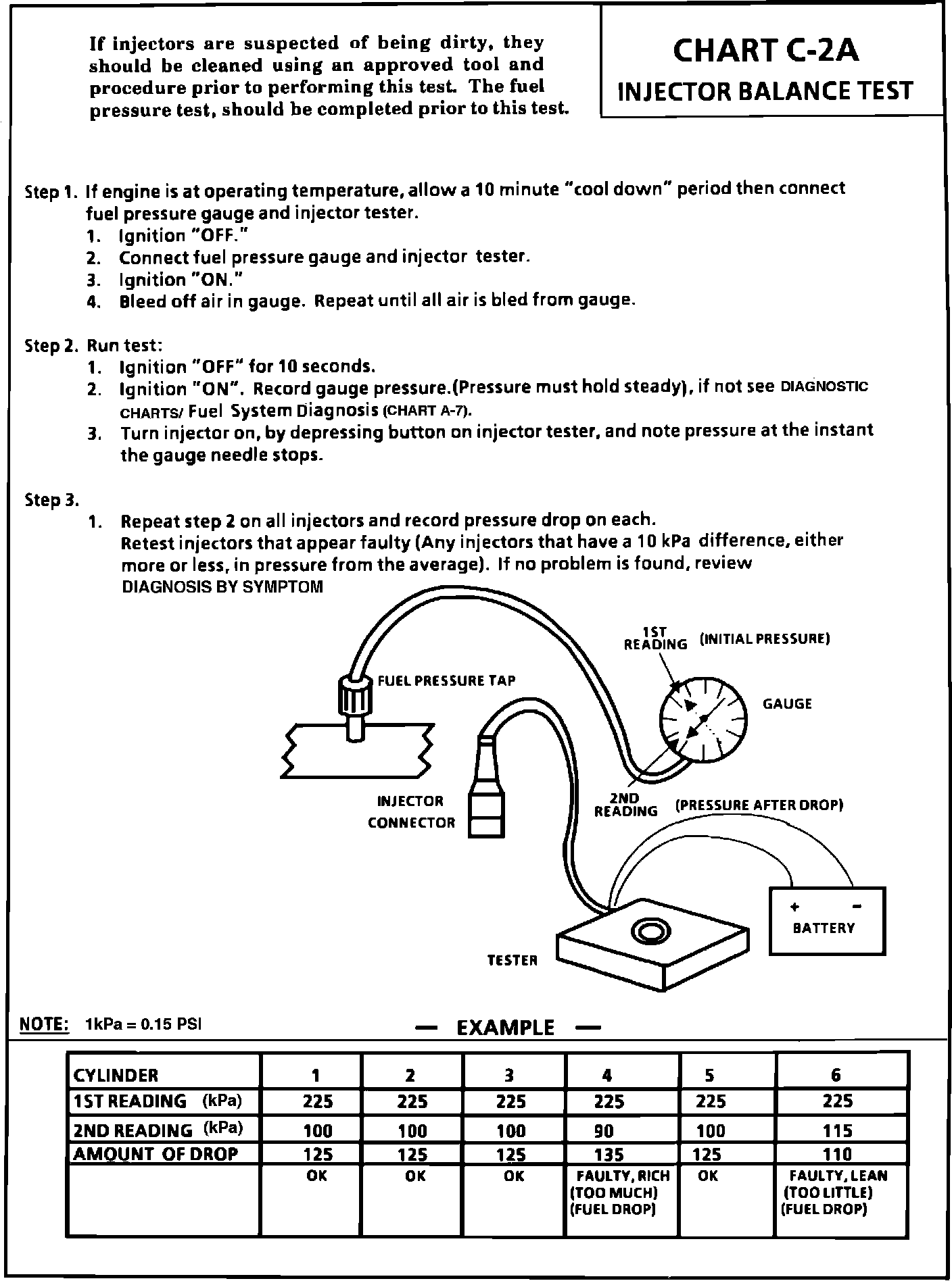 The injector balance tester is a tool used to turn the injector on for a precise amount of time, thus spraying a measured amount of fuel into the manifold. This causes a drop in fuel rail pressure that we can record and compare between each injector. All injectors should have the same amount of pressure drop (+/- 10 kPa). Any injector with a pressure drop that is 10 kPa (or more) greater or less than the average drop of the other injectors should be considered faulty and replaced.