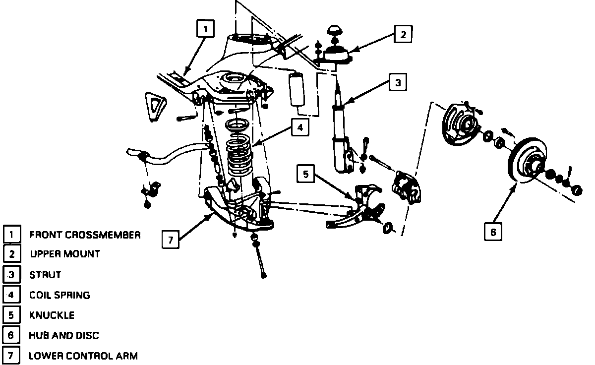 A modified strut type suspension is used on Camaro and Firebird, Fig. 1. Each wheel is independently connected to the chassis by a lower control arm, spindle and a strut assembly which locates the spindle and controls ride by dampening spring action. Coil springs are mounted between the lower control arm and crossmember, and a stabilizer shaft is connected between the chassis and control arms to control side roll.