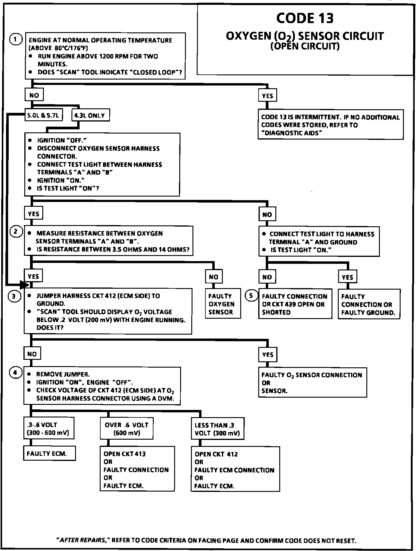 Normal oxygen sensor "Scan" tool voltage varies between 10 mv to 1000 mv (0.1 and 1.0 volts) while in "Closed Loop." Code 13 sets in one minute if voltage remains between 0.35 and 0.55 volts, but the system will go "Open Loop" in about 15 seconds. Verify a clean, tight ground connection for circuit 413. Open circuits 412 or 413 will result in a code 13. If Code 13 is intermittent, - Intermittent Malfunctions