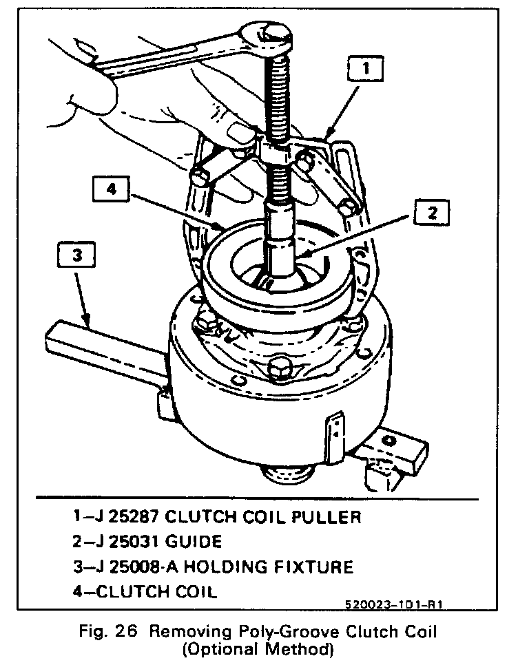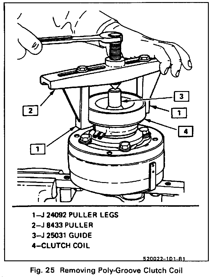 3. Install Rotor and Bearing Puller Guide J 25031 to the front head and install Puller J 8433 with Poly-V-Belt Puller Leg Set J 24092 and remove the clutch coil from the front head (Fig. 25). Clutch coil may also be removed by using rotor and bearing puller guide J 25031 with puller tool J 25287 (Fig. 26).