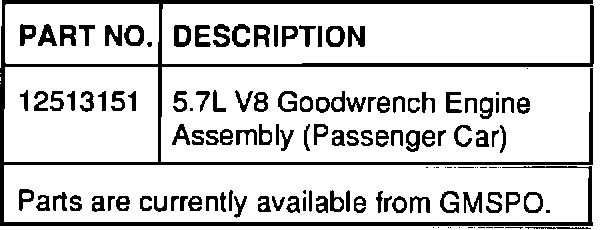 Preferred Method: A 5.7L V8 (VIN 7) "Goodwrench" Engine Assembly (for passenger car application only) has been released to address this concern: