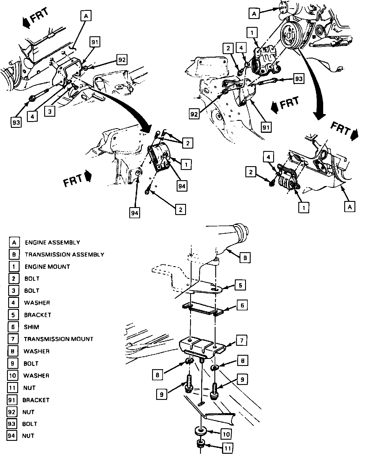 3. Raise front of engine and remove mount to engine bolts and mount. On 4.3L/V6-262 engines, the righthand mount may be removed by loosening the trough bolt. Raise engine only enough to provide sufficient clearance for mount removal. Check for interference between rear of engine and cowl panel which could result in distributor damage.