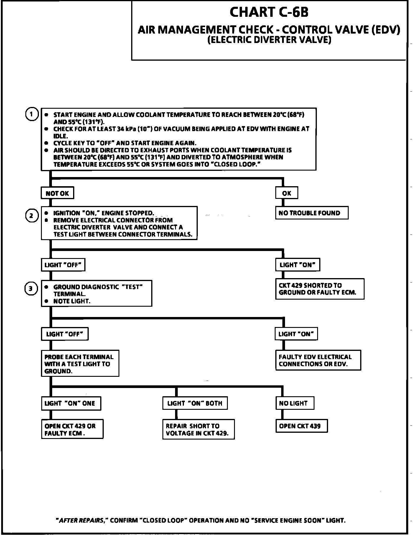 1. If the EDV does not have 10" Hg (34 kPa) of vacuum applied to the valve, inspect for a pinched, plugged, or a leak in the vacuum hose. The ECM should energize the EDV at idle when the coolant temperature is between 20°C (68°F) and 50°C (131°F) and system not in "closed loop." At high rpm between approximately 2000-2500 rpm, the ECM will power off the EDV which will divert air to the atmosphere.