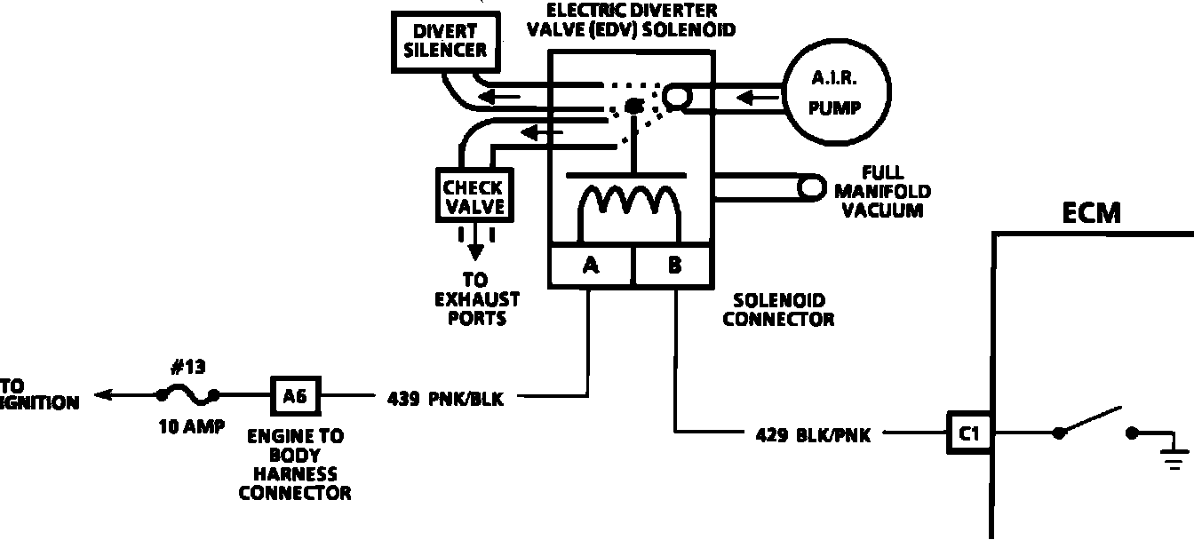 An electric air control valve solenoid directs air into the exhaust ports, or to atmosphere. Air is directed into the exhaust ports whenever the engine is started and the coolant temperature is approximately above 20°C (68°F) and below 50°C (131°F) and the system is in "open loop" and the engine speed is below 1900 rpm. When the vehicle is started and the coolant temperature is below about 20°C (68°F), the air will be diverted to the atmosphere for the entire key cycle.