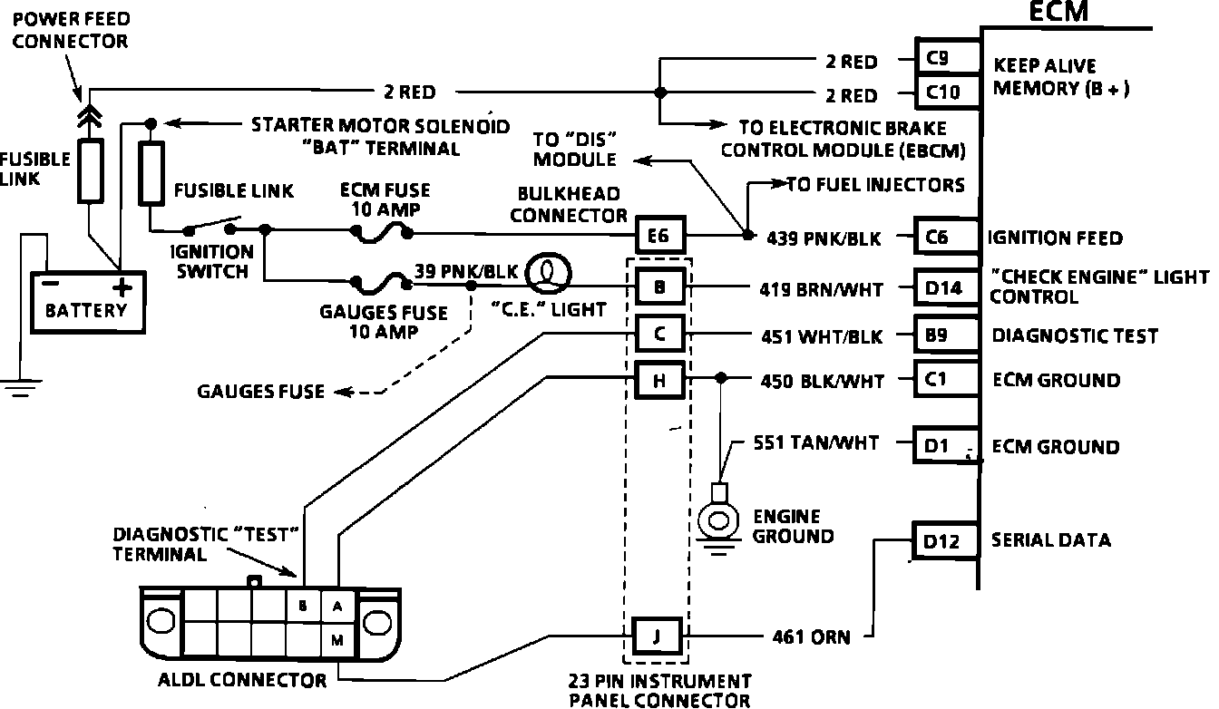There should always be a steady "CHECK ENGINE" light when the ignition is "ON" and engine stopped. Battery voltage is supplied to the light bulb. The ECM will control the light and turn it "ON" by providing a ground path through circuit 419 to the ECM.