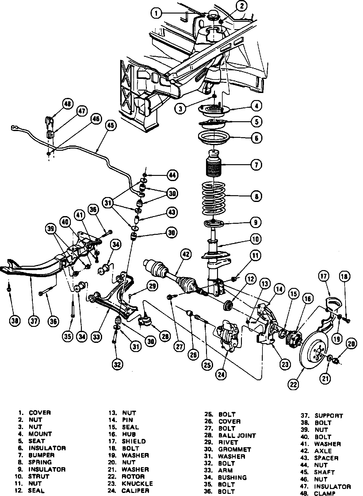 The front suspension, Fig. 1, on these vehicles is of the MacPherson strut design. The lower control arms pivot from the lower side rails through rubber bushings. The upper end of the strut is isolated by a rubber mount incorporating a non-serviceable bearing for wheel turning. The tie rods connect to the steering arm on the strut, below the spring seat. The lower end of the steering knuckle pivots on a ball stud which is retained to the lower control arm by rivets and is secured to the steering knuckle with a nut and cotter pin. The sealed wheel bearings are integral with the hub and are serviced as an assembly.