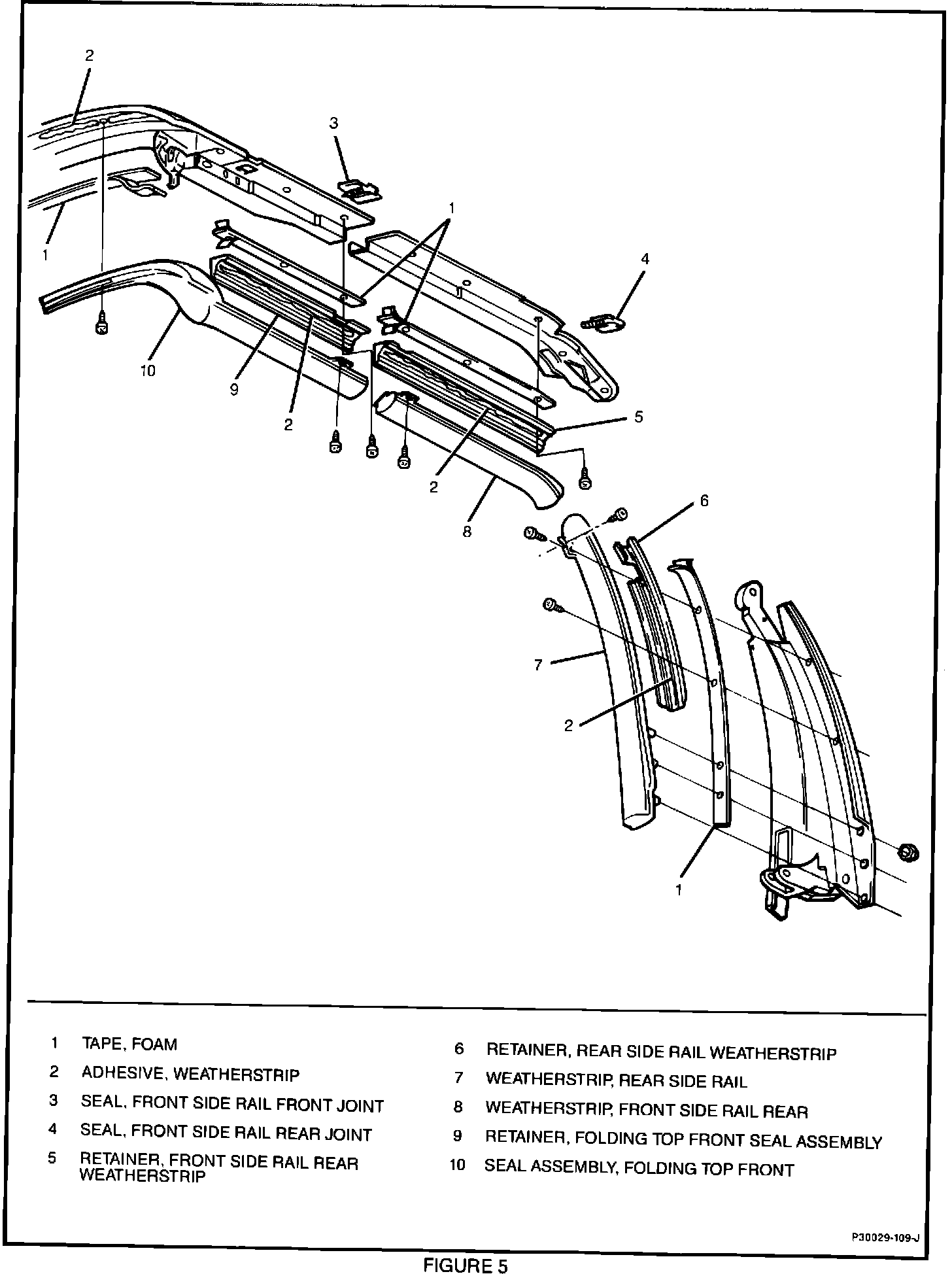 16. Attach LH and RH rear side rail weatherstrip retainers to rear side rails with foam tape. Install screws and tighten securely.