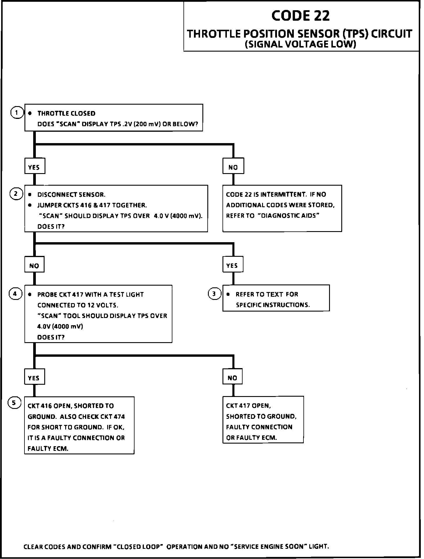 A "Scan" tool reads throttle position in volts. Voltage should increase at a steady rate as throttle is moved toward WOT. Also some "Scan" tools will read throttle angle 0% = closed throttle 100% = WOT An open or short to ground in CKTs 416 or 417 will result in a Code 22. Also, a short to ground in CKT 474 will result in a Code 22. - Intermittent Malfunctions