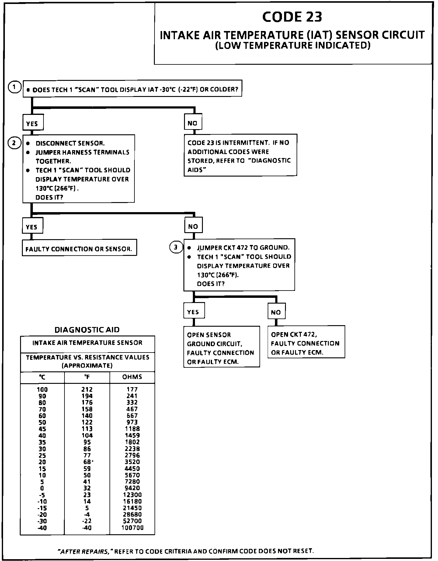 ^ Codes 23 and 34 stored at the same time, could be the result of an open CKT 469. The "Temperature to Resistance Values" scale in the chart above may be used to test the IAT sensor at various temperature levels to evaluate the possibility of a "slewed" (mis-scaled) sensor. A "slewed" sensor could result in poor driveability complaints.