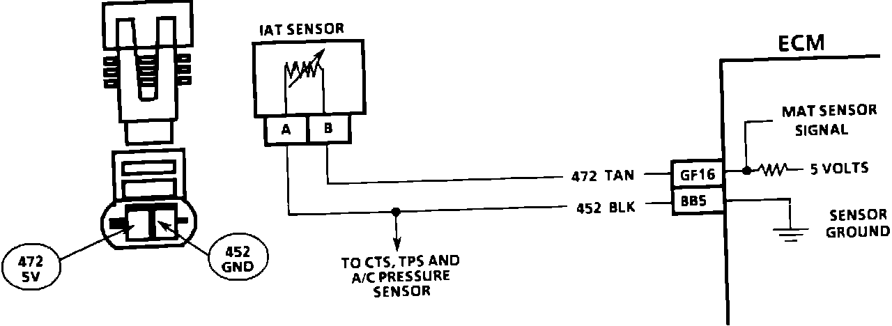 The IAT sensor uses a thermistor to control the signal voltage at the ECM. The ECM applies a voltage (about 5 volts) on CKT 472 to the sensor. When the air is cold the sensor (thermistor) resistance is high, therefore the ECM terminal "GF16" voltage will be high. If the air is warm the sensor resistance is low, therefore the ECM terminal "GF16" voltage will be low.
