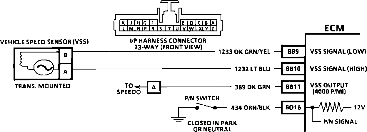 ^ "Scan" should indicate a vehicle speed whenever the drive wheels are turning greater than 3 mph. A problem in CKT 381 will not affect the VSS input or the readings on a "Scan."