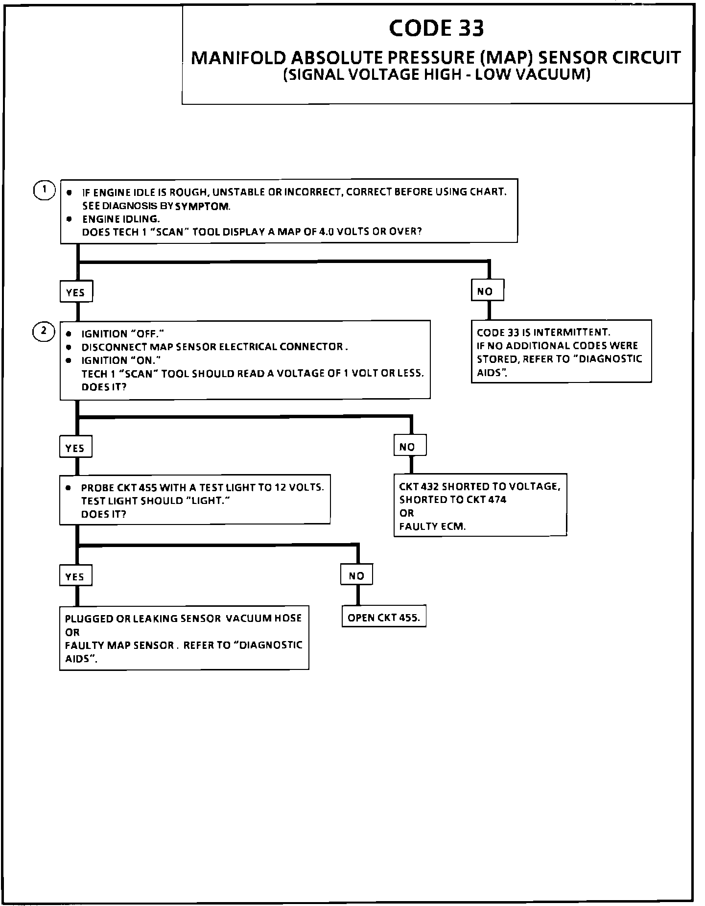 ^ Make sure electrical connection remains securely fastened. Check all connections. Disconnect sensor from bracket and twist sensor by hand (only) to check for intermittent connections. Output changes greater than 0.1 volt indicate a bad connector or connection. If OK, replace sensor. For further diagnosis, Chart C-1D Manifold Absolute Pressure (MAP) Output Check