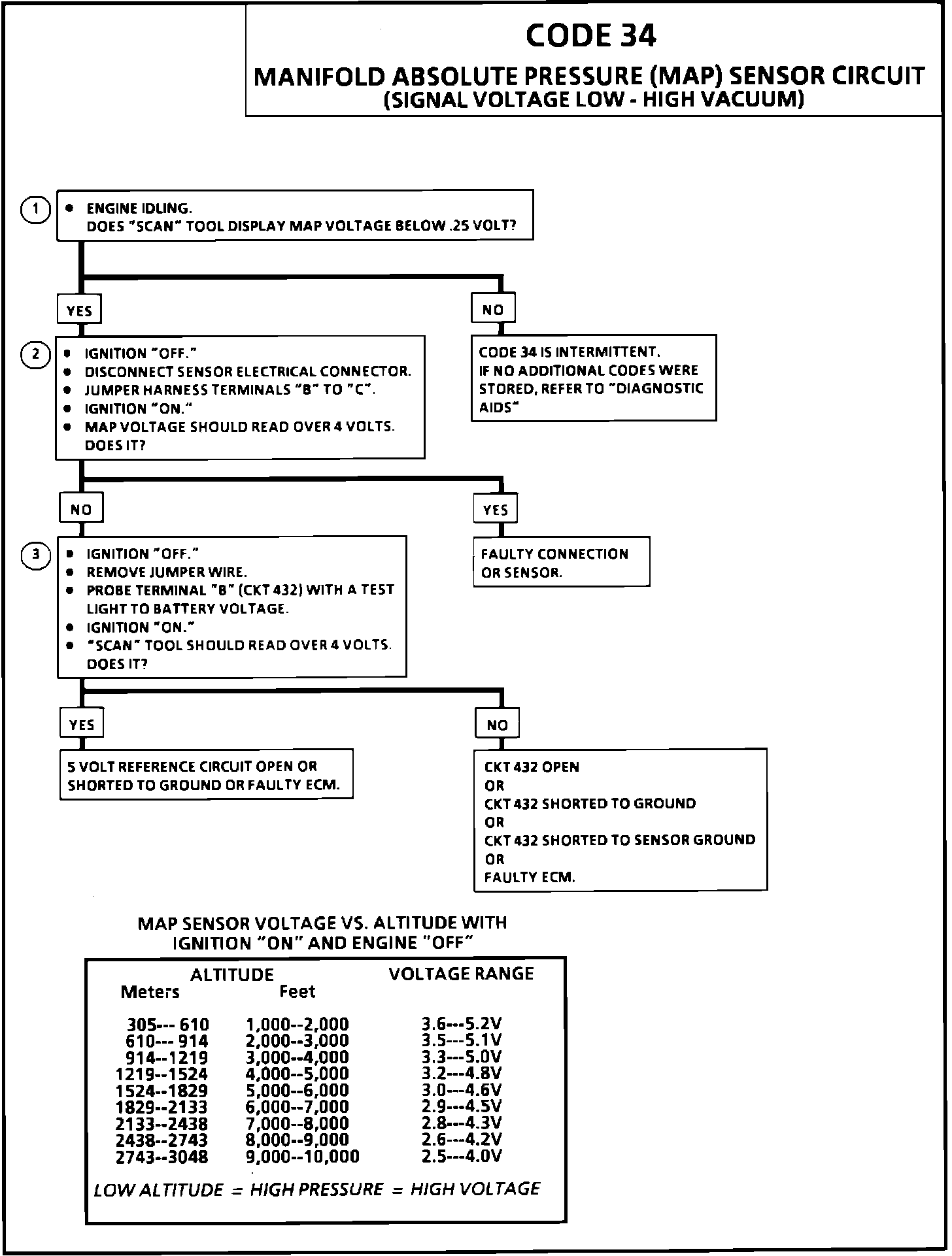 The Manifold Absolute Pressure (MAP) Sensor responds to changes in manifold pressure (vacuum). The Electronic Control Module (ECM) receives this information as a signal voltage that will vary from about 1 to 2 volts at idle (high vacuum) to 4-4.8 volts at wide open throttle (low vacuum). If the MAP sensor fails, the ECM will substitute a fixed MAP value and use the throttle position sensor to control fuel delivery.