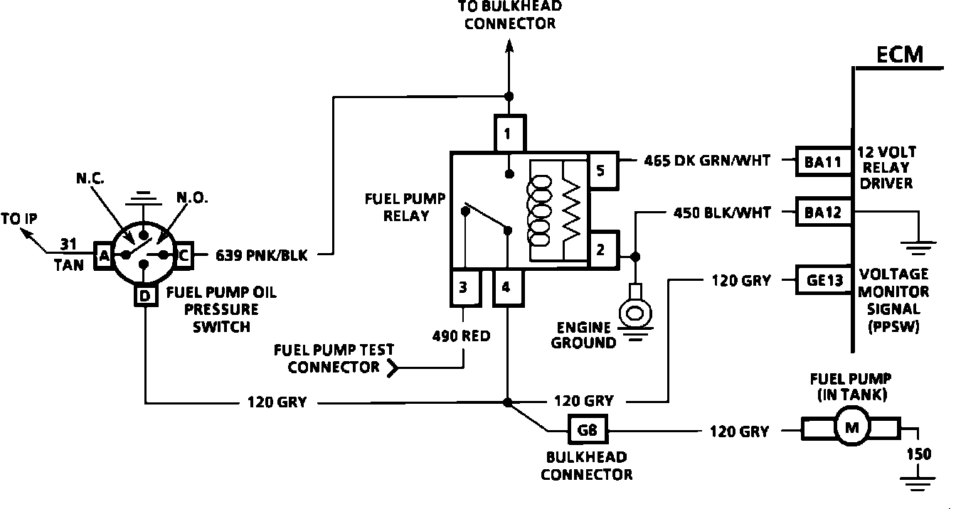 The status of the fuel pump CKT 120 is monitored by the ECM at terminal "GE13" and is used to compensate fuel delivery based on system voltage. This signal is also used to store a code if the fuel pump relay is defective or fuel pump voltage is lost while the engine is running. There should be about 12 volts on CKT 120 for at least 2 seconds after the ignition is turned, or any time reference pulses are being received by the ECM.