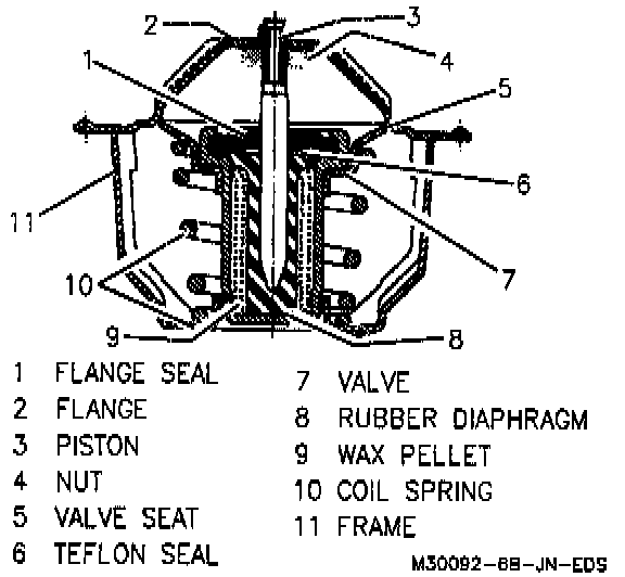 A pellet-type thermostat is used in the coolant outlet passage to control the flow of engine coolant, to provide fast engine warm-up and to regulate coolant temperatures. A wax pellet element in the thermostat expands when heated and contracts when cooled. The pellet element is connected through a piston to a valve. When the pellet element is heated, pressure is exerted against a rubber diaphragm which forces the valve to open. As the pellet element is cooled, the contraction allows a spring to close the valve. The valve remains closed while the coolant is cold, preventing circulation of coolant through the radiator. At this point, coolant is allowed to circuit only throughout the engine to warm it quickly and evenly.