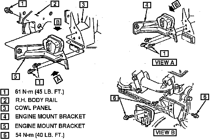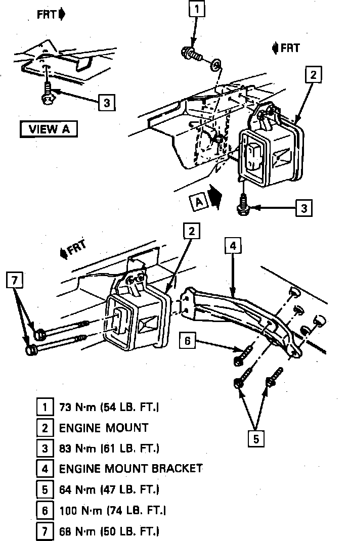 7. Reverse procedure to install, using new engine mount bolts. Remove alignment bolt. Refer to Fig. 1, for tightening specifications. If excessive force is required to remove alignment bolt, loosen transaxle adjusting bolts to align power train components.