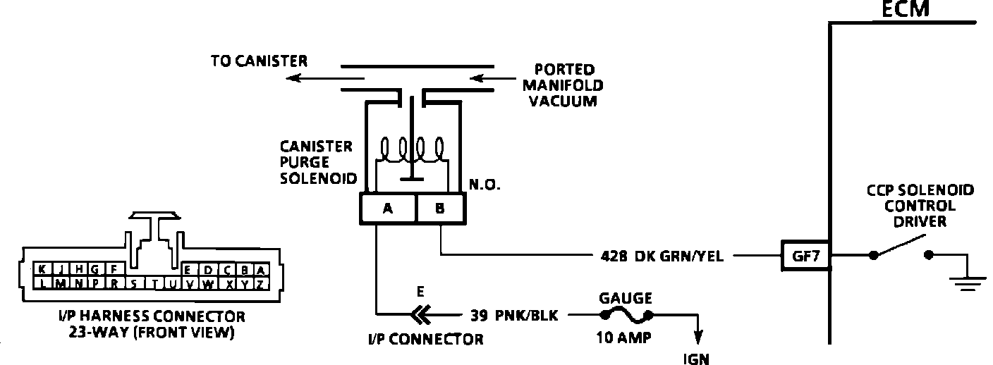 The canister purge is controlled by a solenoid that allows manifold vacuum to purge the canister when de-energized. The ECM controls the ground to power the solenoid. The purge solenoid is controlled by a pulse width modulation signal from the ECM. The duty cycle is determined by the amount of air flow, and by the MAP sensor input.